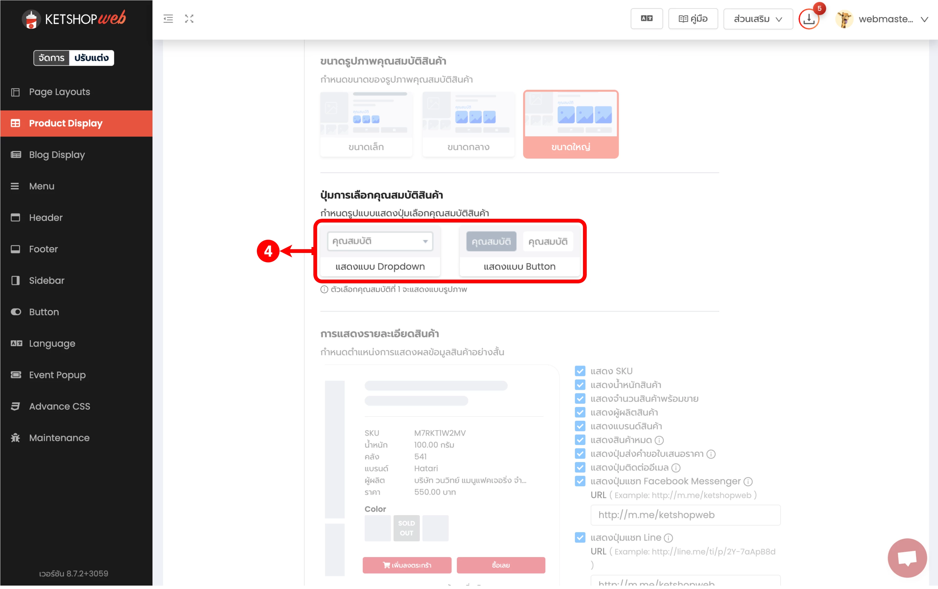 เลื่อนลงมาที่การตั้งค่า 'ปุ่มการเลือกคุณสมบัติสินค้า' ซึ่งมีทั้งหมด 2 รูปแบบให้เลือกใช้