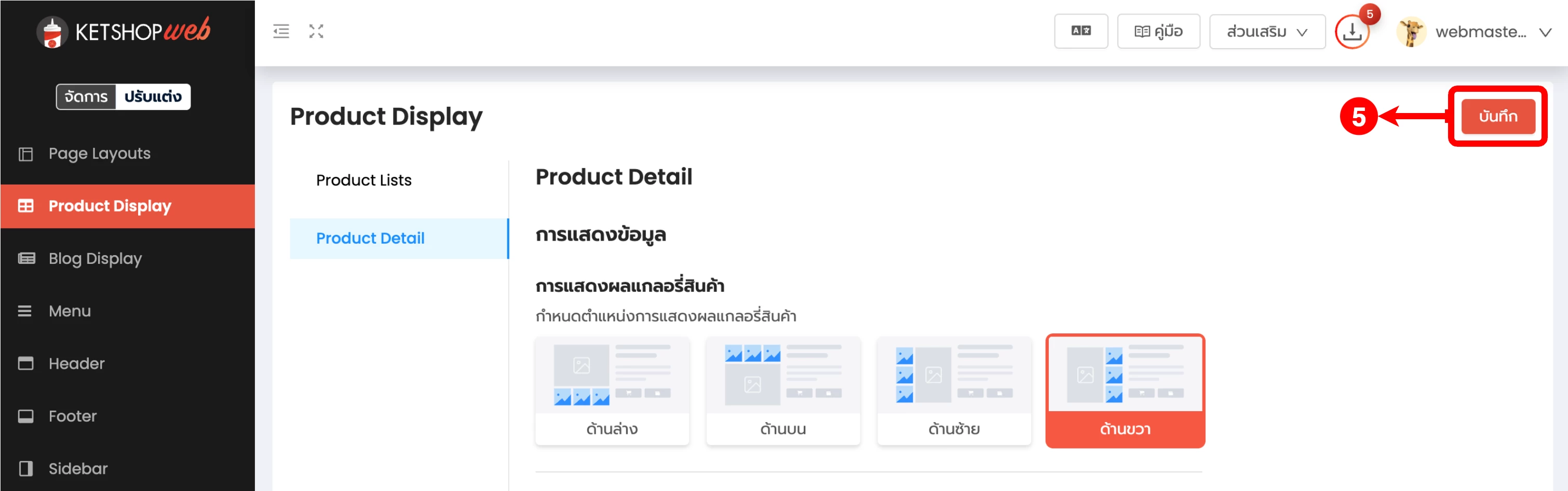 (ตำแหน่งที่ 5) คลิกปุ่ม 'บันทึก' หลังจากเลือกใช้งานการแสดงปุ่มเรียบร้อย
