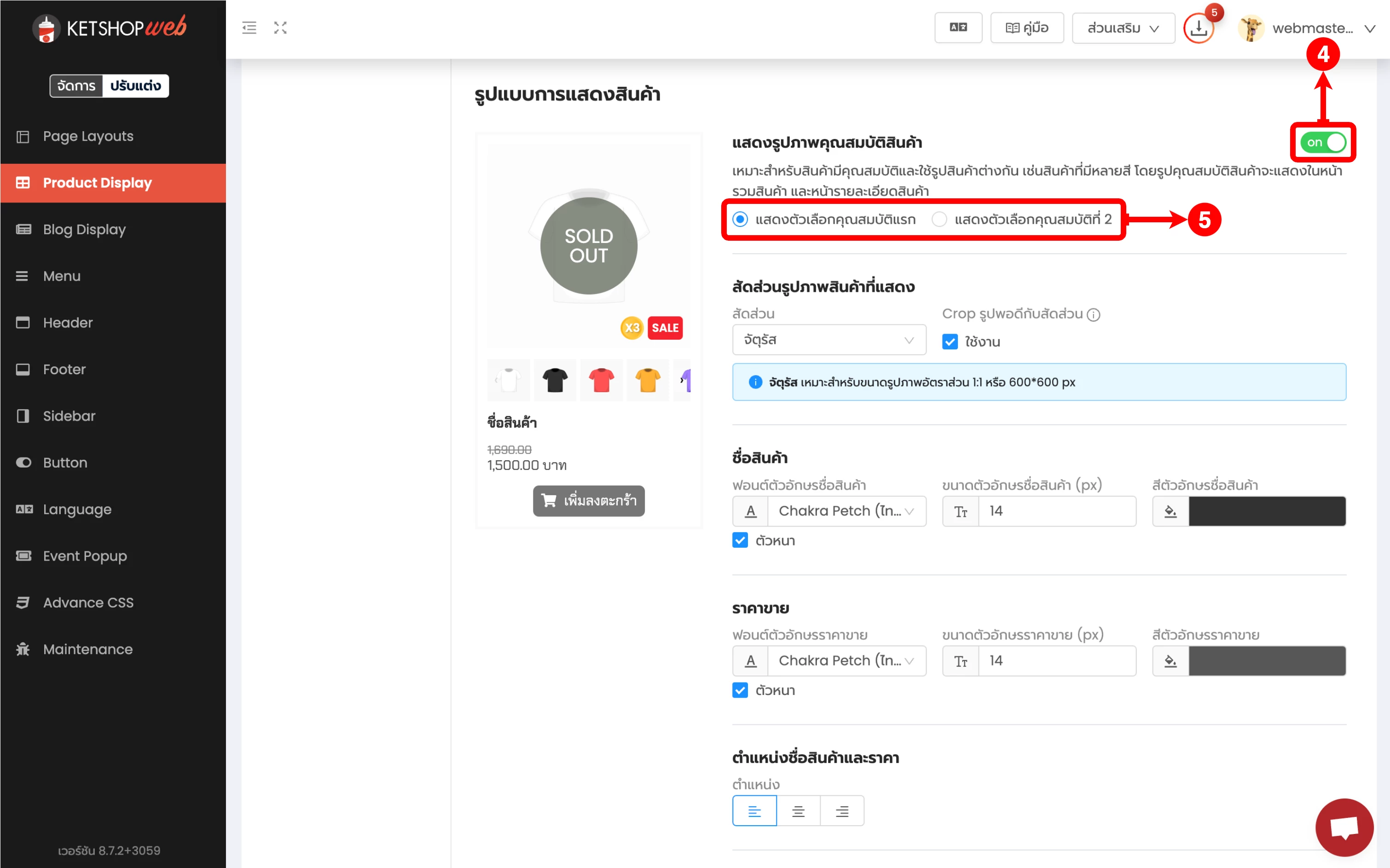 (ตำแหน่งที่ 4) คลิก ON เพื่อเปิดแสดงรูปภาพคุณสมบัติสินค้า